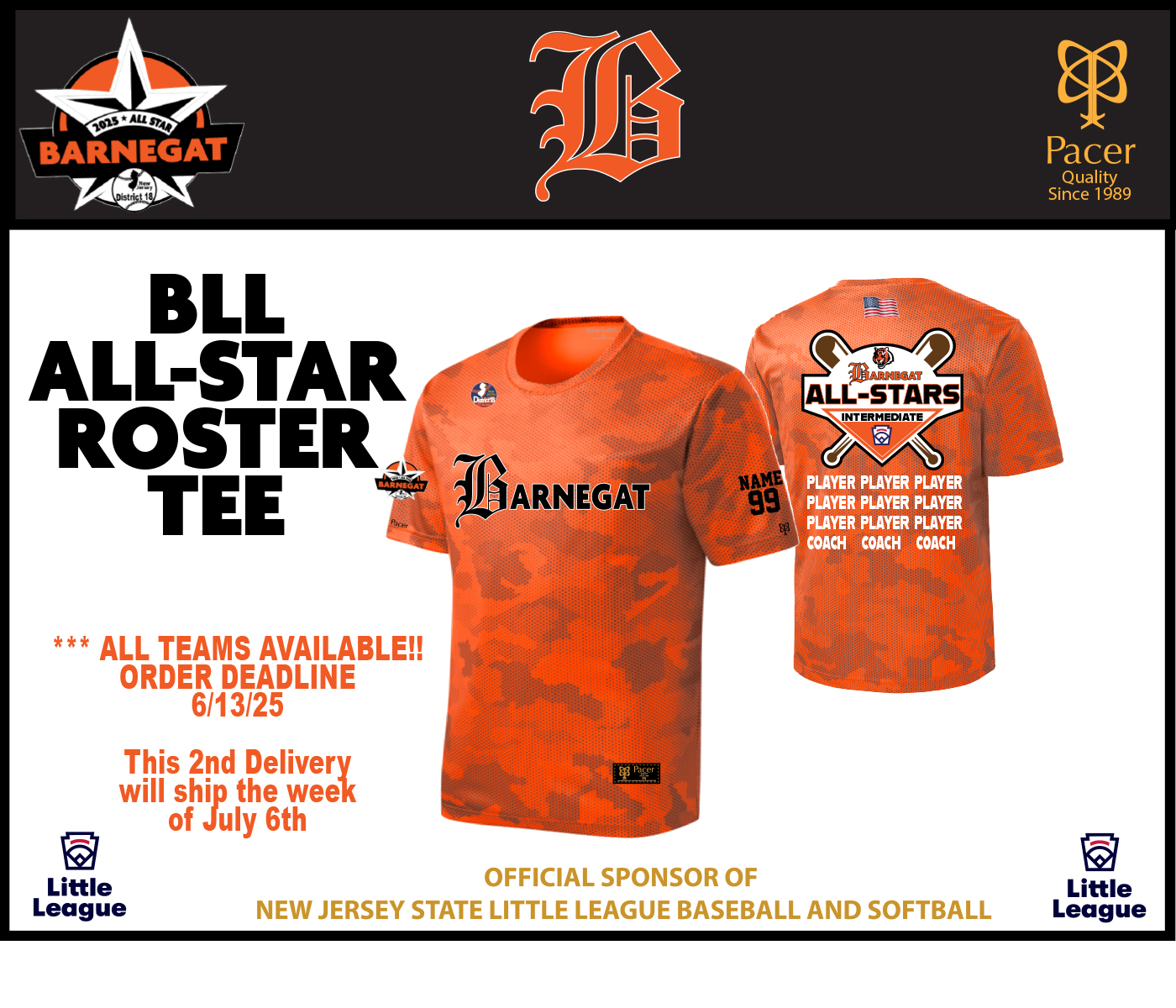 INTRODUCING THE OFFICIAL 2025 BARNEGAT LITTLE LEAGUE ALL-STAR ROSTER TEE by PACER. Show support for your favorite League & Team by wearing one of these Short Sleeve Performance Tees around town. Adorned with the Official Barnegat Little League "B" Logo on the Front Left Chest, the District 18 All Star Logo on the Rt Front Clavicle, the Barnegat All Star Crest on the Rt Sleeve and the Teams Roster Logo & American Flag on the rear all Fully Sublimated for a Lifetime of Washes without Fading or Cracking.