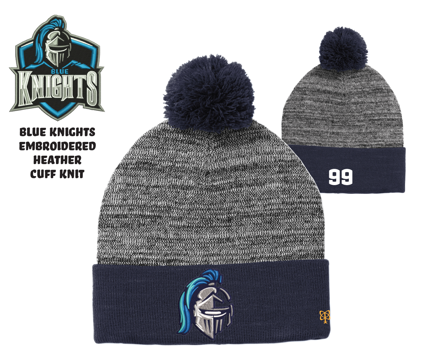 Introducing the Official BLUE KNIGHTS EMBROIDERED HEATHERED CUFF KNIT made exclusively for the Knights Players and Families by Pacer. 100% Performance Acrylic Cuff Knit w Pom-pom adorned with the Official Blue Knights Embroidered Mascot Logo on the front.