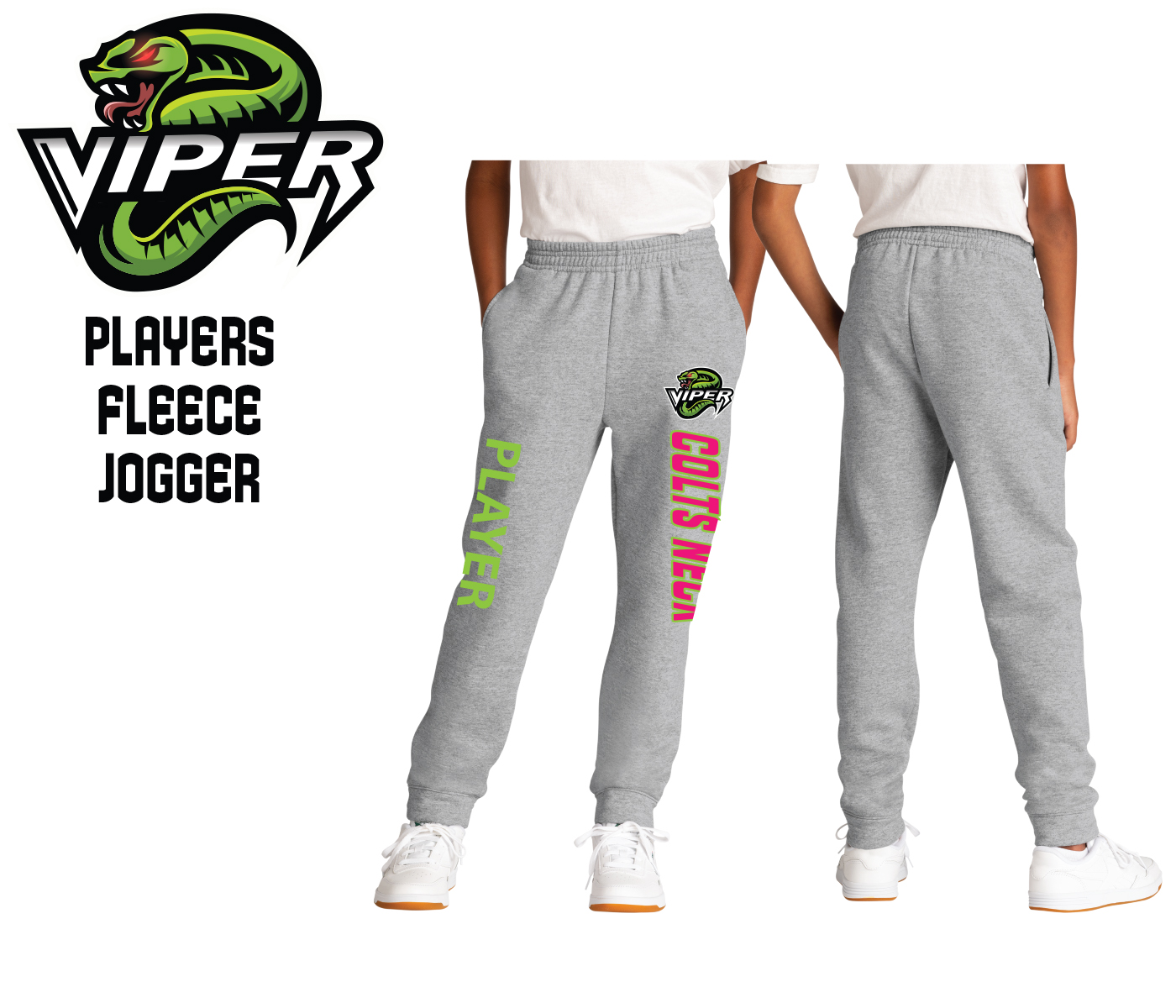 Introducing the Colts Neck Pit-Vipers Fleece Jogger Pant. Made exclusively for the Vipers Players & Fans by PACER. Show your support for your favorite Athlete & Team by wearing one of these 7.8 oz Cotton/Poly Fleece Joggers which have an incredibly Soft and Relaxed unisex fit. Each comes with the Official Vipers Mascot & Wordmark Logo.