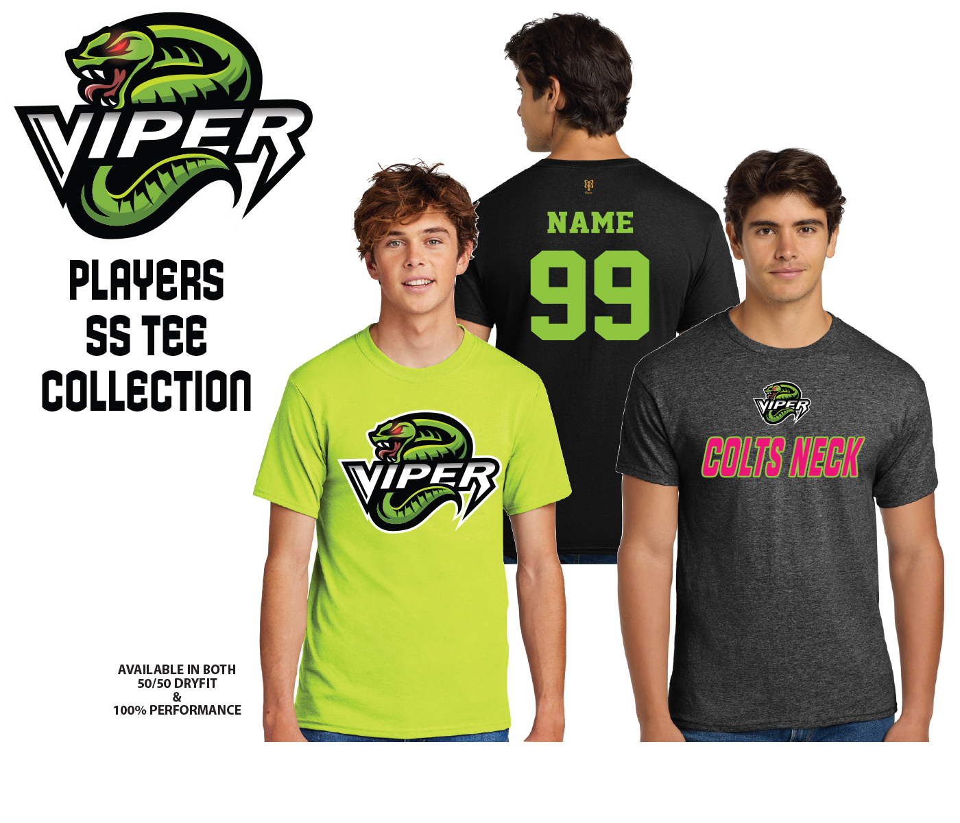 INTRODUCING THE OFFICIAL COLTS NECK PIT-VIPERS SHORT SLEEVE PLAYERS TEE COLLECTION by PACER. Show your support for your favorite player & team by wearing one or more of these Short Sleeve Tee's around town. Adorned with your choice of the Pit-Vipers Mascot Logo or Wordmark/Mascot Logo on the Front Chest in a High Density Silicone Application.
