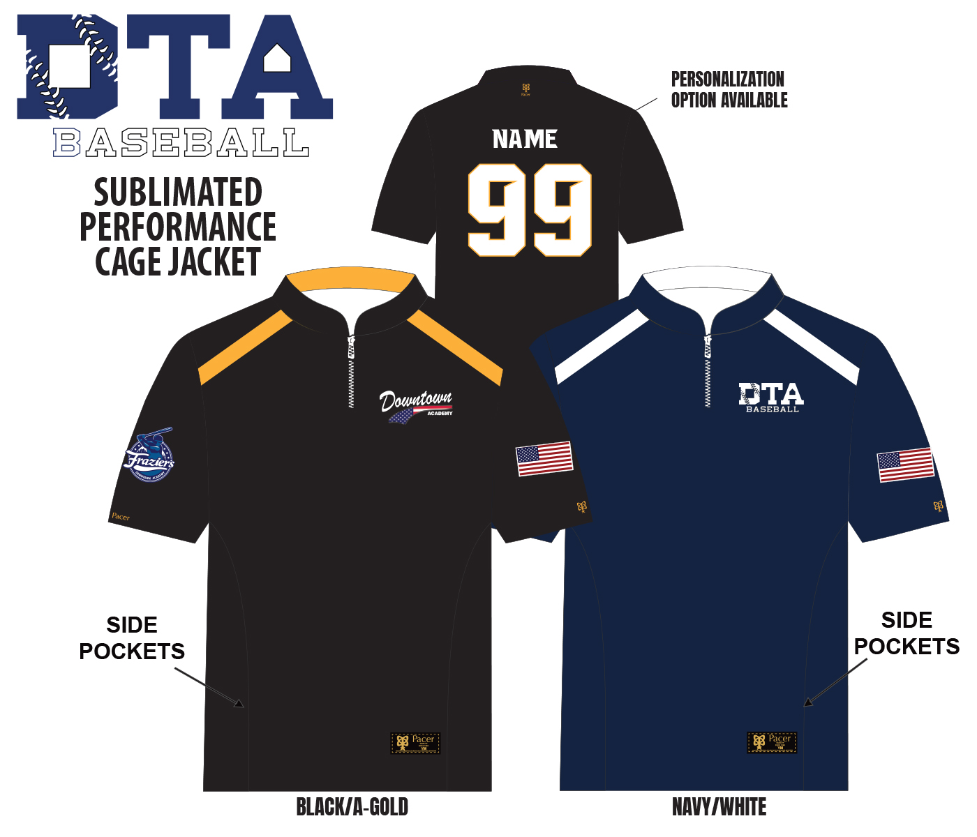 INTRODUCING THE FRAZIER'S DOWNTOWN ACADEMY OFFICIAL FULLY SUBLIMATED SHORT SLEEVE LIGHTWEIGHT PERFORMANCE CAGE JACKET by PACER. Look Sharp and Feel good wearing this Ultra Lite Weight Performance Short Sleeve Qtr Zip Pullover. Available in two Color Options, Olive Drab/Athletic Gold colorway is adorned with the Official Downtown Academy Stars & Stripes Logo on the left front chest while the Navy/White colorway is adorned with the Official DTA Baseball Logo on the left front chest. Both Colorways come with the Official Frazier Baseball Logo on the Right Sleeve and the American Flag on the Left. All fully sublimated for a Lifetime of Washes without Cracking or Peeling and featuring a 100% Dri-Power Performance Polyester with Quick-Dry & Anti Microbial Properties added for comfort. So whether your Coaching the Bases, taking BP or walking around town, show support for your favorite Organization by purchasing one today.
