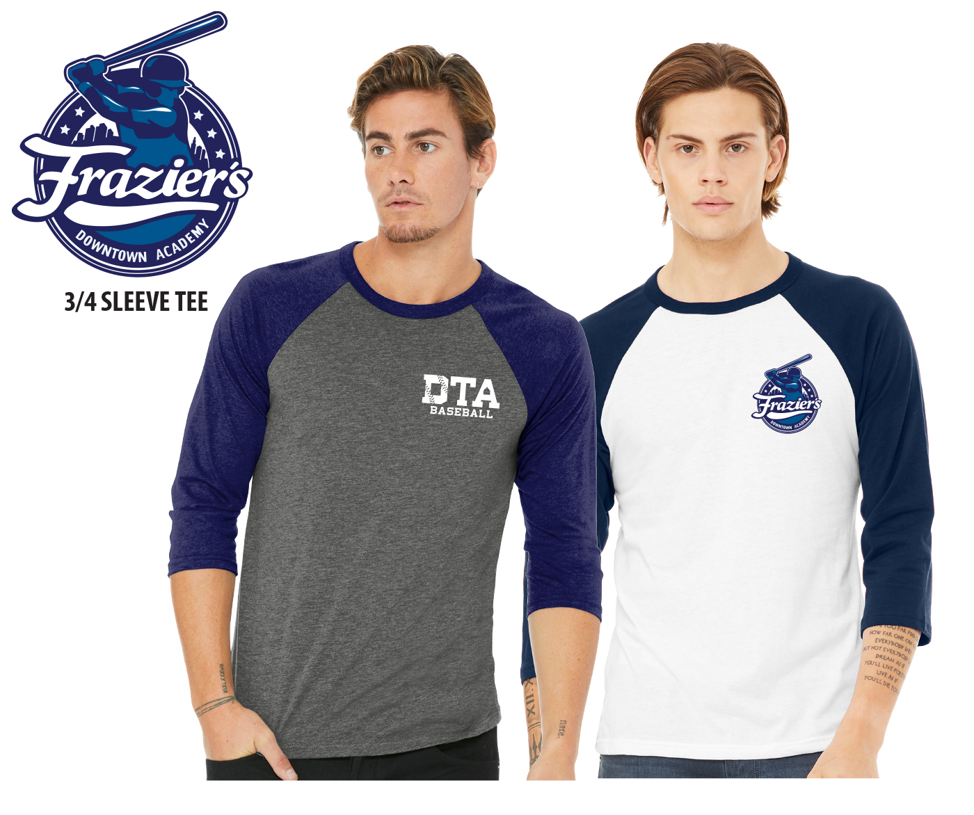 INTRODUCING THE OFFICIAL FRAZIER'S DOWNTOWN ACADEMY TRI-BLEND 3/4 SLEEVE BASEBALL TEE COLLECTION by PACER. Show your support for your favorite player & team by wearing one or more of these 3/4 Sleeve Tees around town. Adorned with your choice of the Official Frazier's Baseball Academy Logo or the DTA Baseball Logo on the Front Left Chest in a High Density Silicone Application.