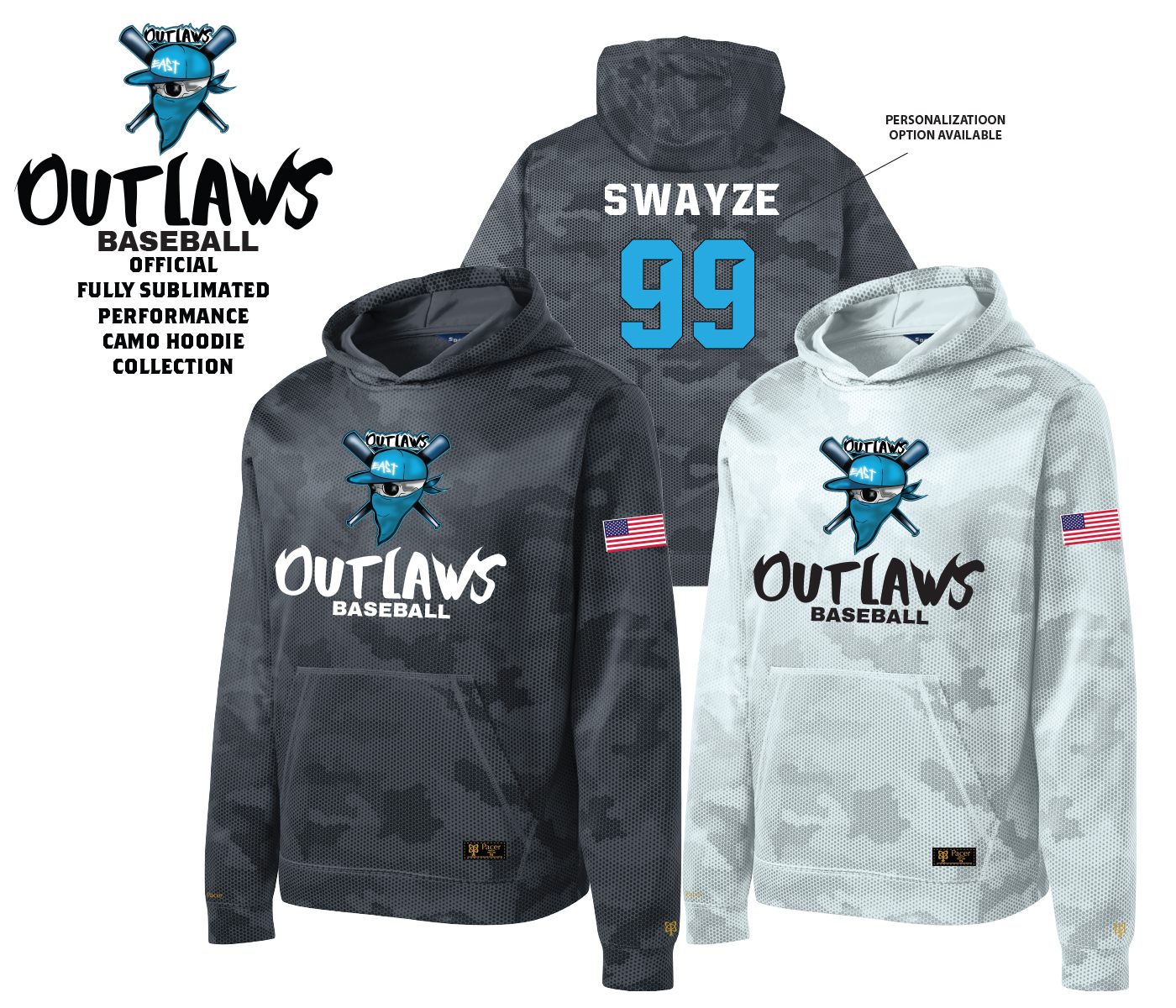 INTRODUCING THE TOMS RIVER EAST OUTLAWS FULLY SUBLIMATED HEX CAMO PERFORMANCE FLEECE HOODIE COLLECTION by PACER. Show support for your favorite Player & Team by wearing one of these Unisex Pullover Fleece Hoodie's Adorned with an all-over Sublimated Digital Camo Print with the Official East Outlaws Mascot-Word Logo on the Front Chest and American Flag on the left sleeve.