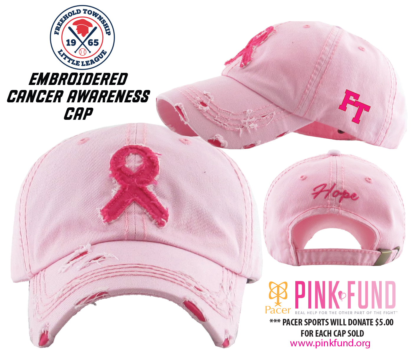 Show your support for your Favorite Organization while helping bring awareness to a very worthy cause by wearing one of these 100% Cotton Twill Pink Distressed Caps adorned with an Embroidered Front Pink Ribbon Logo, FTLL Side Logo & Hope Embroidered on the Rear.