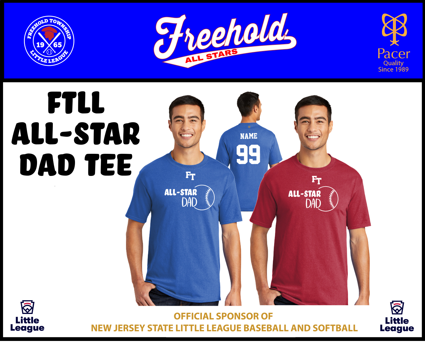 Introducing the Freehold Township Little League Official All-Star Dad Cotton Tee Collection. Made exclusive for the FTLL Membership for the All Star Season by PACER. Show your support for your Favorite All-Star & Team by wearing one of these Cotton Tee's around. Each comes with our Official On-Field All-Star Dad Logo on the Front Chest in a High Definition Silicone Application.