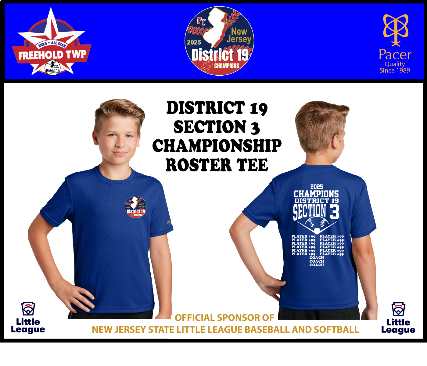 INTRODUCING THE OFFICIAL 2025 FREEHOLD TOWNSHIP LITTLE LEAGUE DISTRICT 18 / SECTION 3 CHAMPIONSHIP ROSTER TEE by PACER. Help Celebrate our very own 2025 DISTRICT 19 & SECTION 3 CHAMPIONSHIP SEASON by wearing this 100% Performance Polyester Tee around town. Adorned with the Official D19 Champs Logo on the Front Left Chest & District 19/Section 3 Champions Roster Logo on the back in a High Density Silicon Application.