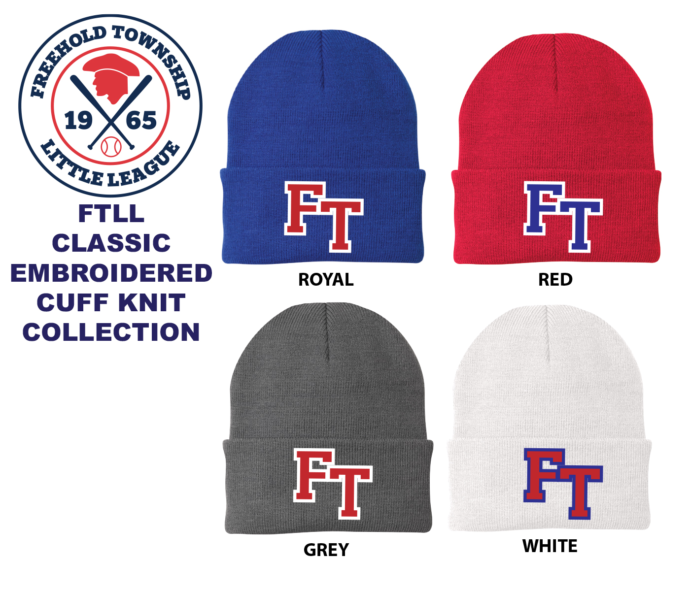 Introducing the FREEHOLD TOWNSHIP LITTLE LEAGUE Official Embroidered Cuff Knit Collection made exclusively for the FTLL Membership by PACER. Produced to keep you warm during those cold days & nights. Available in 4 Colorways w Roll Up Cuff adorned with the 2-Color Interlocking FT Logo Embroidered on the front.