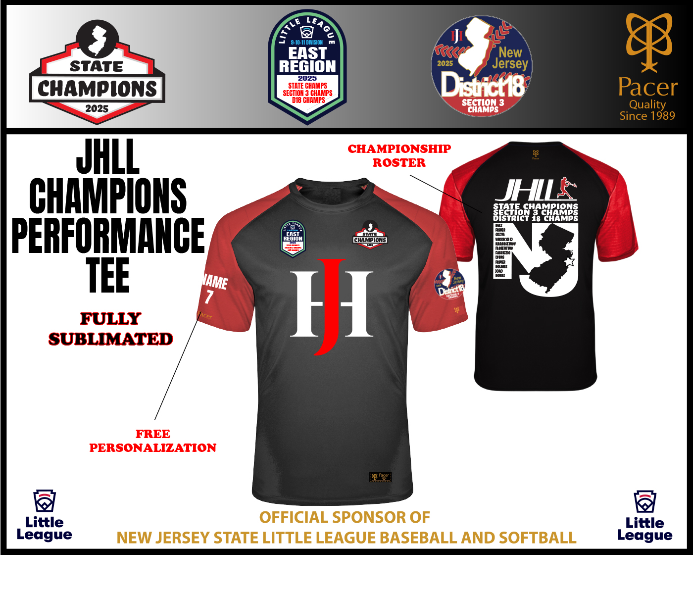 INTRODUCING THE OFFICIAL 2025 JACKSON/HOLBROOK LITTLE LEAGUE CHAMPIONSHIP PERFORMANCE C-BLOCK ROSTER TEE by PACER. Help Celebrate our very own 2025 EASTERN REGION - STATE CHAMPS - SECTION 3 & DISTRICT 18 CHAMPIONSHIP SEASON by wearing this 100% Performance Poly Short Sleeve Tee around town. Adorned with the Official Little League Eastern Region Logo on the Front Right Clavicle complete with the Major Championships Earned, State Champs Logo on the Left Clavicle, Interlocking JH on the Front Chest & the Championship Teams Roster Listed on the back all fully Sublimated for a Lifetime of Washes without Cracking or Peeling.
