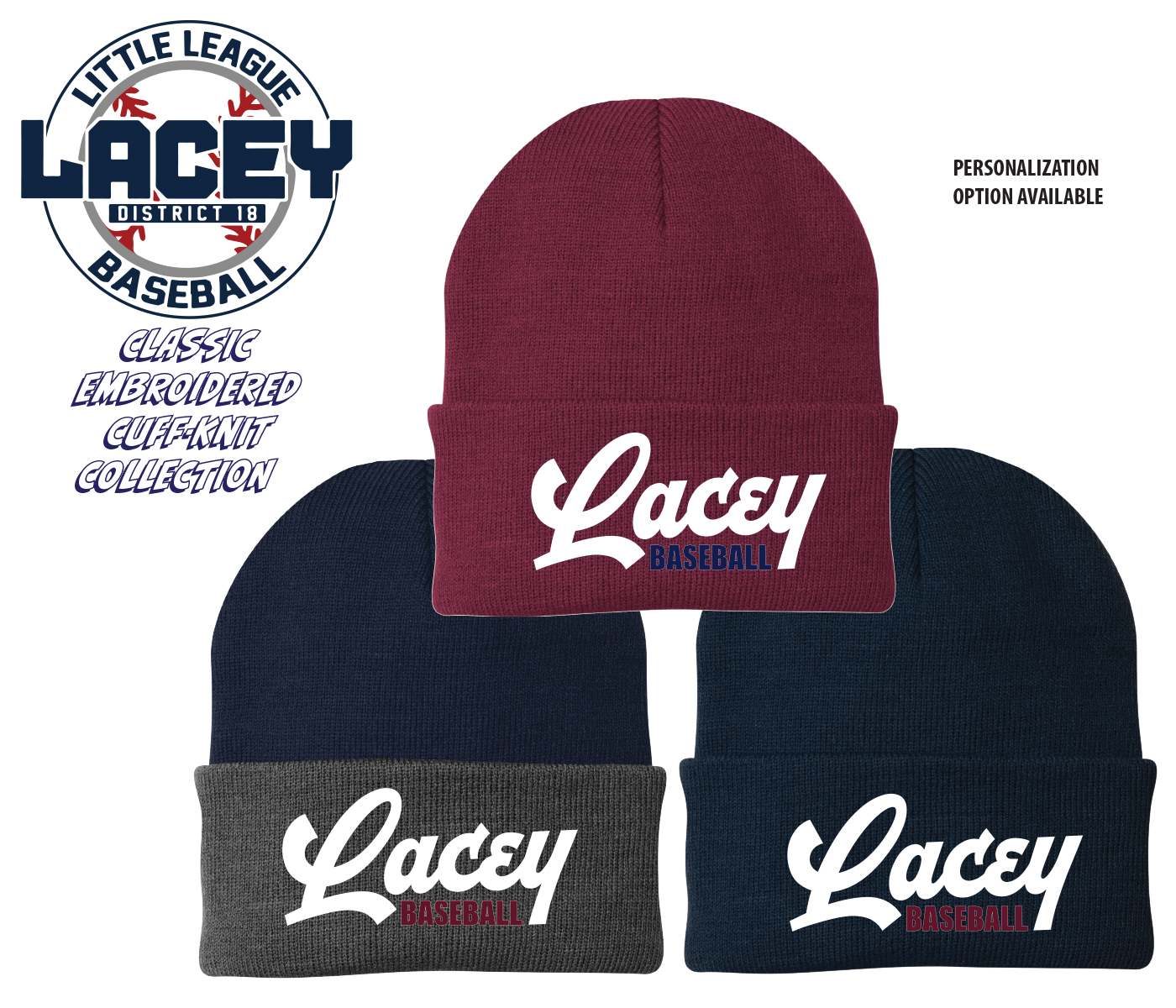Introducing the Official Lacey Little League Embroidered Cuff Knit Collection made exclusively for the Leagues Membership by PACER. 100% Performance Acrylic Cuff Knits adorned with the Official Lacey Little League Baseball Wordmark Embroidery.