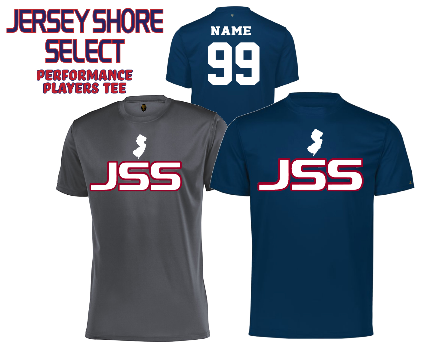 Introducing the Jersey Shore Select Performance Players Tee Collection by Pacer. Show Support our very own JSS Players by wearing one or more of these 100% Performance Poly Short Sleeve Tee's around town. Adorned with the Official JSS Logo on the Front Chest in a High Density Silicone Vinyl Application.