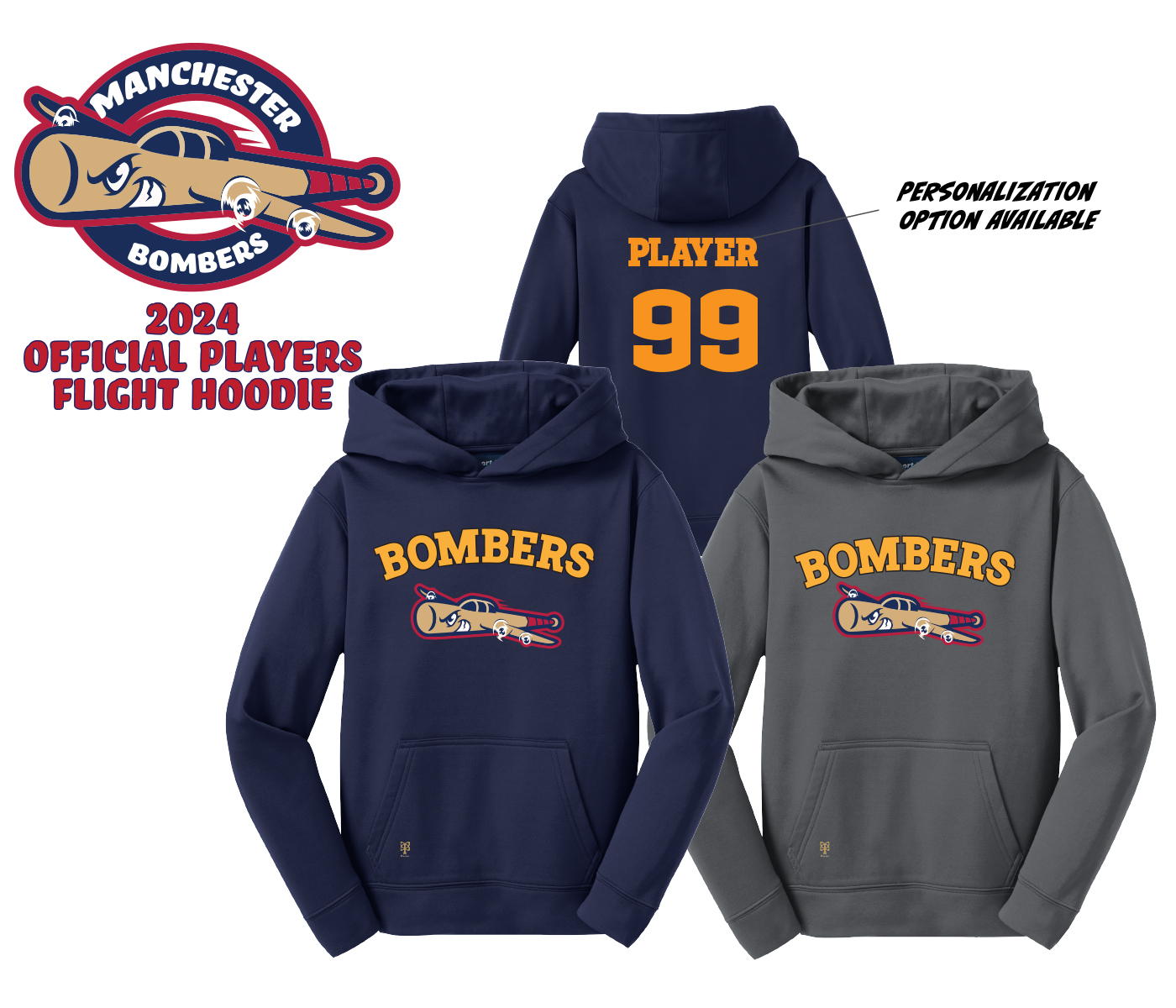 Introducing the Manchester Bombers Player Flight Hoodie Collection. Made exclusively for the Bomber Players & Families by PACER.Show your support for your Favorite Player & Team by wearing one or more of these 9oz Ringspun Cotton PULL-OVER HOODIES which have an incredibly Soft and Relaxed unisex fit. Each comes with the NEW Official Bombers Flight Logo in a High Density Silicone Application.