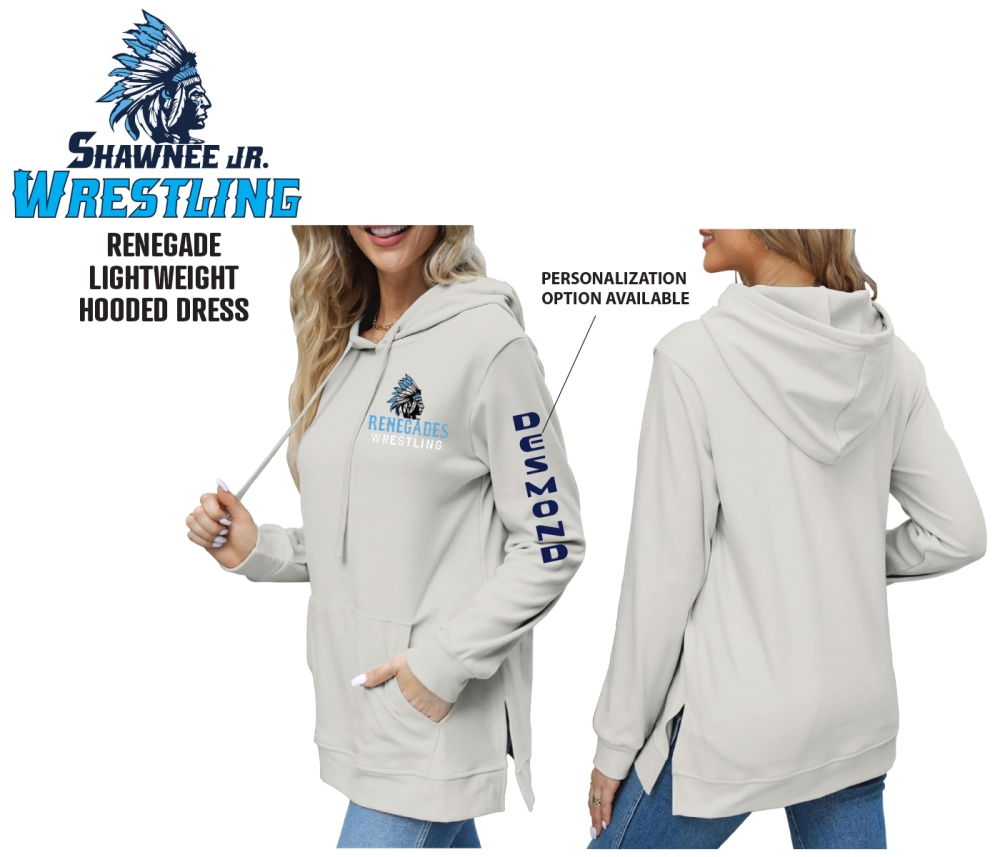 INTRODUCING THE OFFICIAL SHAWNEE RENEGADES FLEECE HOODED DRESS by PACER. The Steel Grey Lightweight Hooded Dress features the Official Renegade Mascot Logo on the Front Left Chest in a High Density Silicone Application.