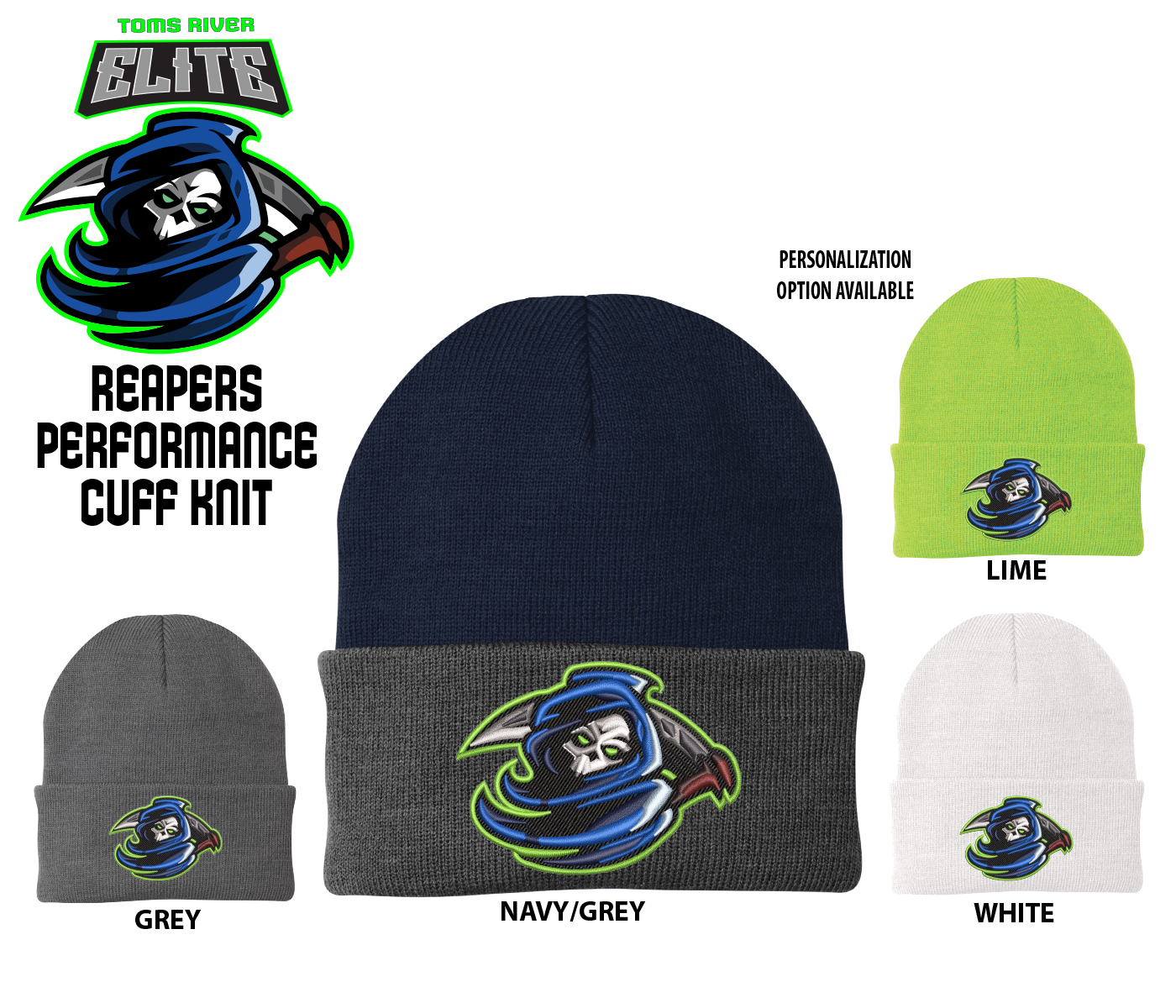 Introducing the Toms River Elite Performance Cuff Knit made exclusively for the Reapers Players and Families by PACER. 100% Performance Acrylic Cuff Knits available in your choice of Solid Grey, Solid White, Navy/Grey & Solid Lime Green adorned with the Official Blue Reapers Mascot Logo Embroidery on the front.