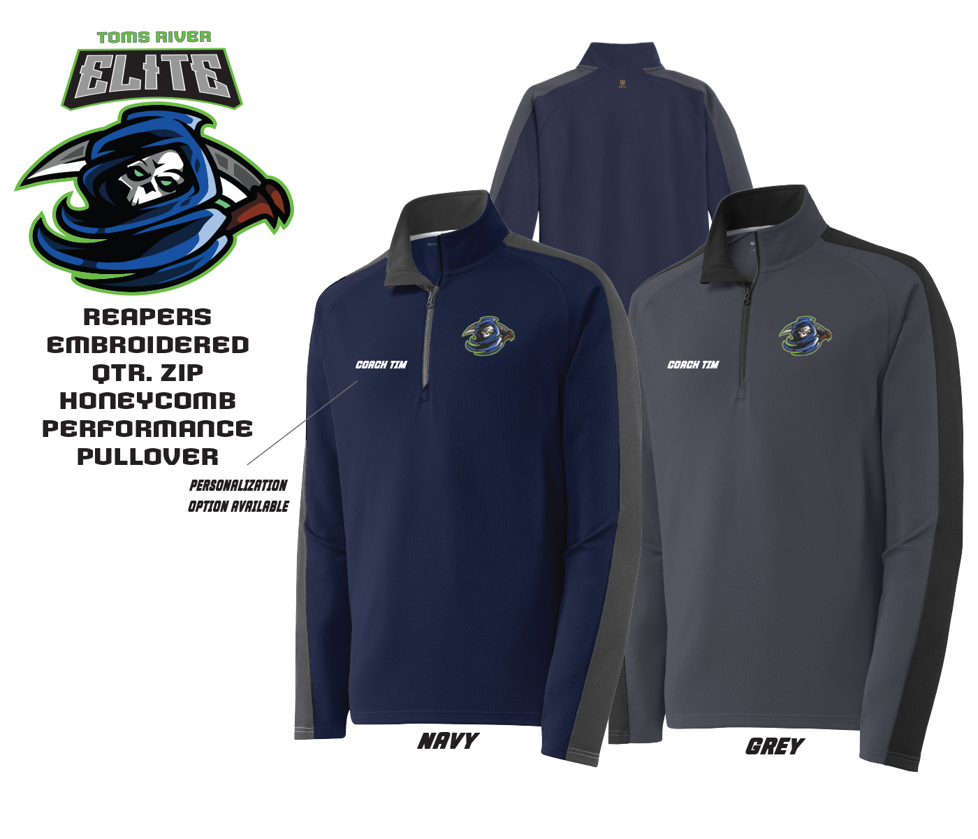 INTRODUCING THE TOMS RIVER ELITE QTR ZIP HONEYCOMB PULLOVER FLEECE COLLECTION by PACER. Show support for your Favorite Player & Team by wearing one or more of these Unisex Pullover Fleece Hoodies Adorned with the Official Reapers Mascot Logo Embroidered on the Front Left Chest.