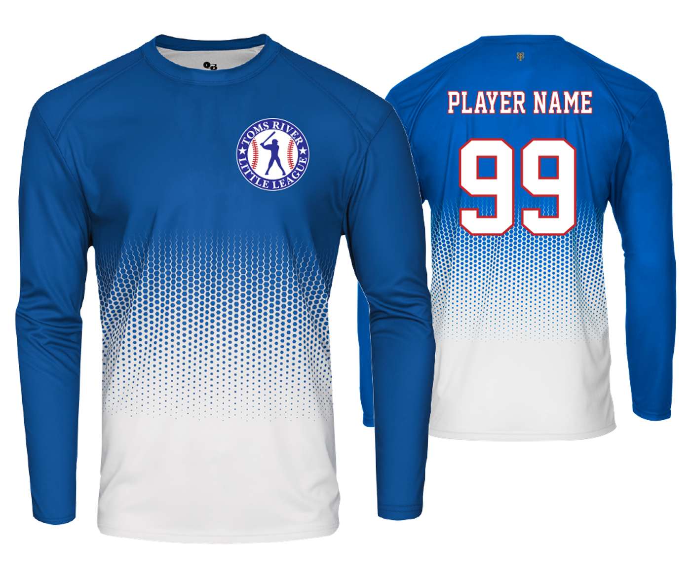 Introducing the Toms River Little League Long Sleeve Performance BP FADE Jersey. Made exclusively for the TRLL Membership by PACER.Show your support for your Favorite Player & Team by wearing one or more of these Performance Short Sleeve Batting Practice Jerseys. Each comes with the Official TRLL Circle Logo on the Front Left Chest in a High Density Ruberized Application