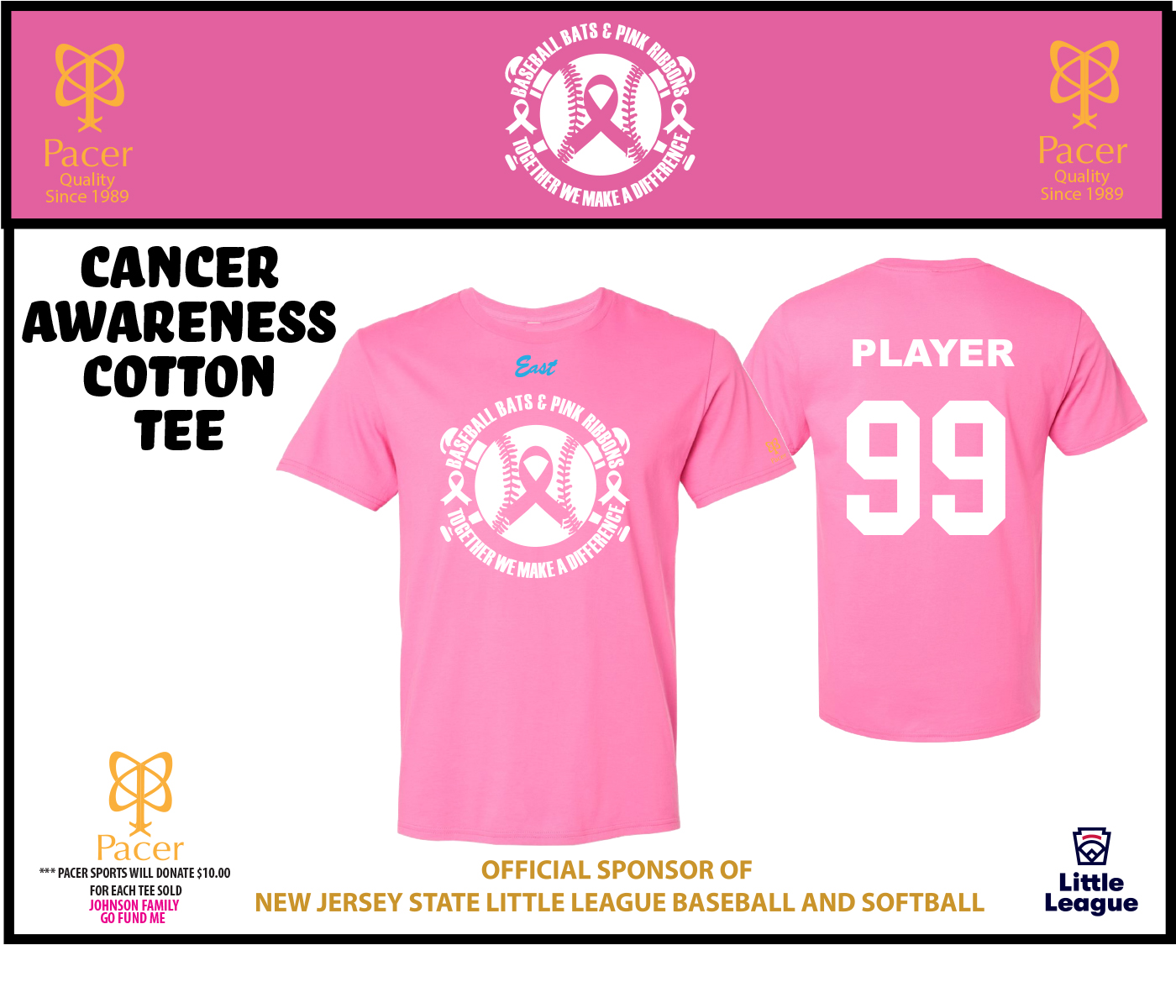 Introducing Toms River East Little League's Cancer Awareness Short Sleeve Tee for 2025. This years tee strikes home as all donations will be going to one of our own families that have been hit hard by this disease. We will be donating $10 for each Tee sold directly to the Johnson Families Go Fund Me page with hopes that we can assist the family at this terrible time.