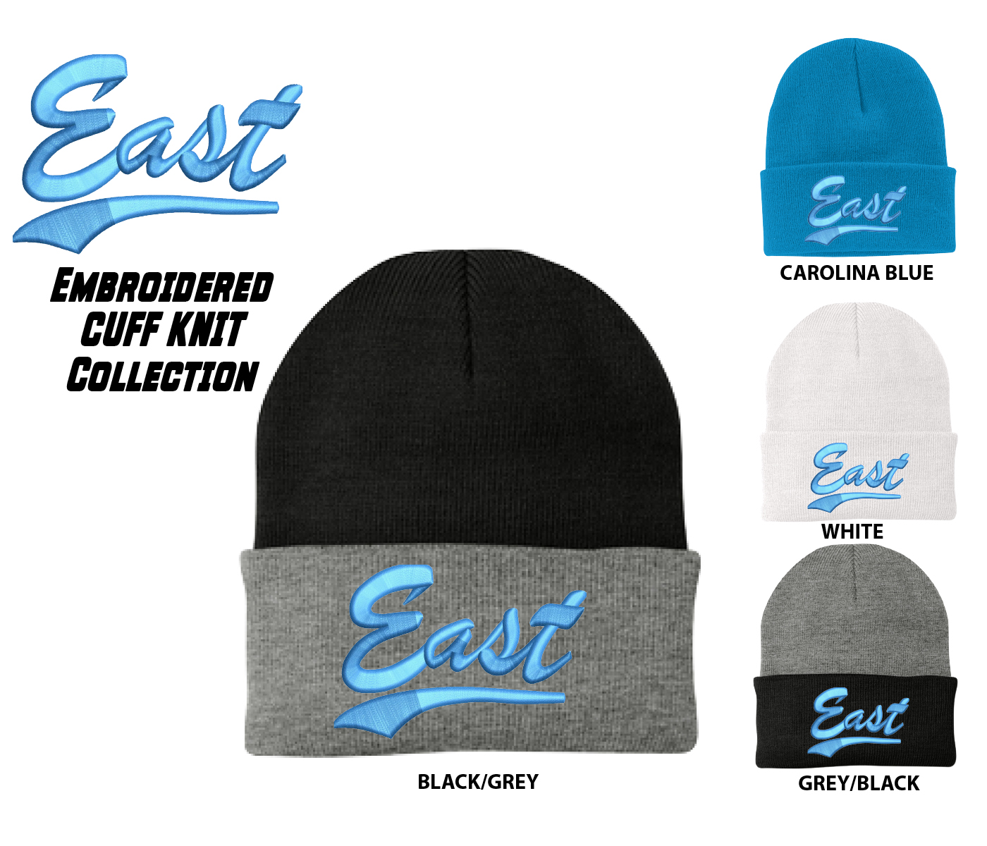 Introducing the Toms River East Little League Embroidered Cuff Knit made exclusively for TRELL Players and Families by PACER. 100% Performance Acrylic Cuff Knits available in your choice of Grey/Black, White, Carolina Blue & Grey/Black adorned with the Official Script East Logo Embroidery on the front.