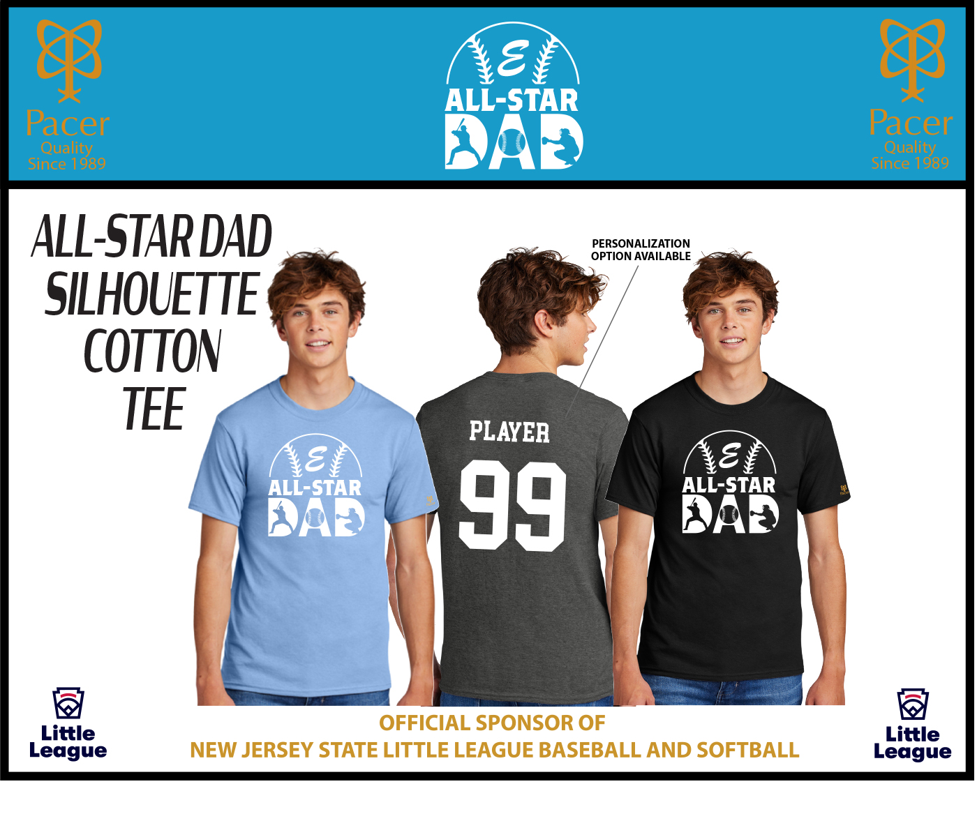 Introducing the Toms River East Little League Official All-Star Dad Silhouette Cotton Tee Collection. Made exclusive for the TRELL Membership for the All Star Season by PACER. Show your support for your Favorite All-Star & Team by wearing one of these Cotton Tee's around. Each comes with our Official On-Field All-Star Silouette Logo on the front chest.