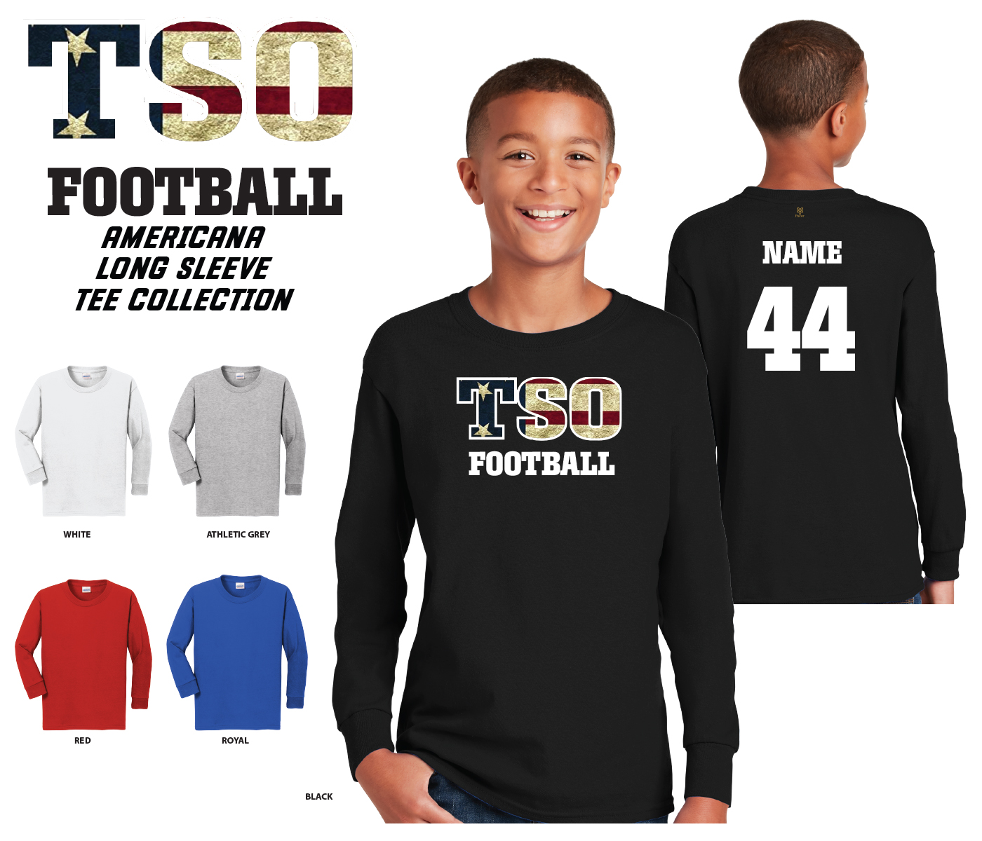 Introducing the TSO FOOTBALL Americana Long Sleeve Tee Collection. Made exclusive for the TSO Membership for by PACER. Show your support for your favorite League by wearing one or more of these 6 oz Ring Spun Cotton Shirts which have an incredibly Soft and Relaxed unisex fit. Each comes with the TSO Americana Print on the Front Chest.